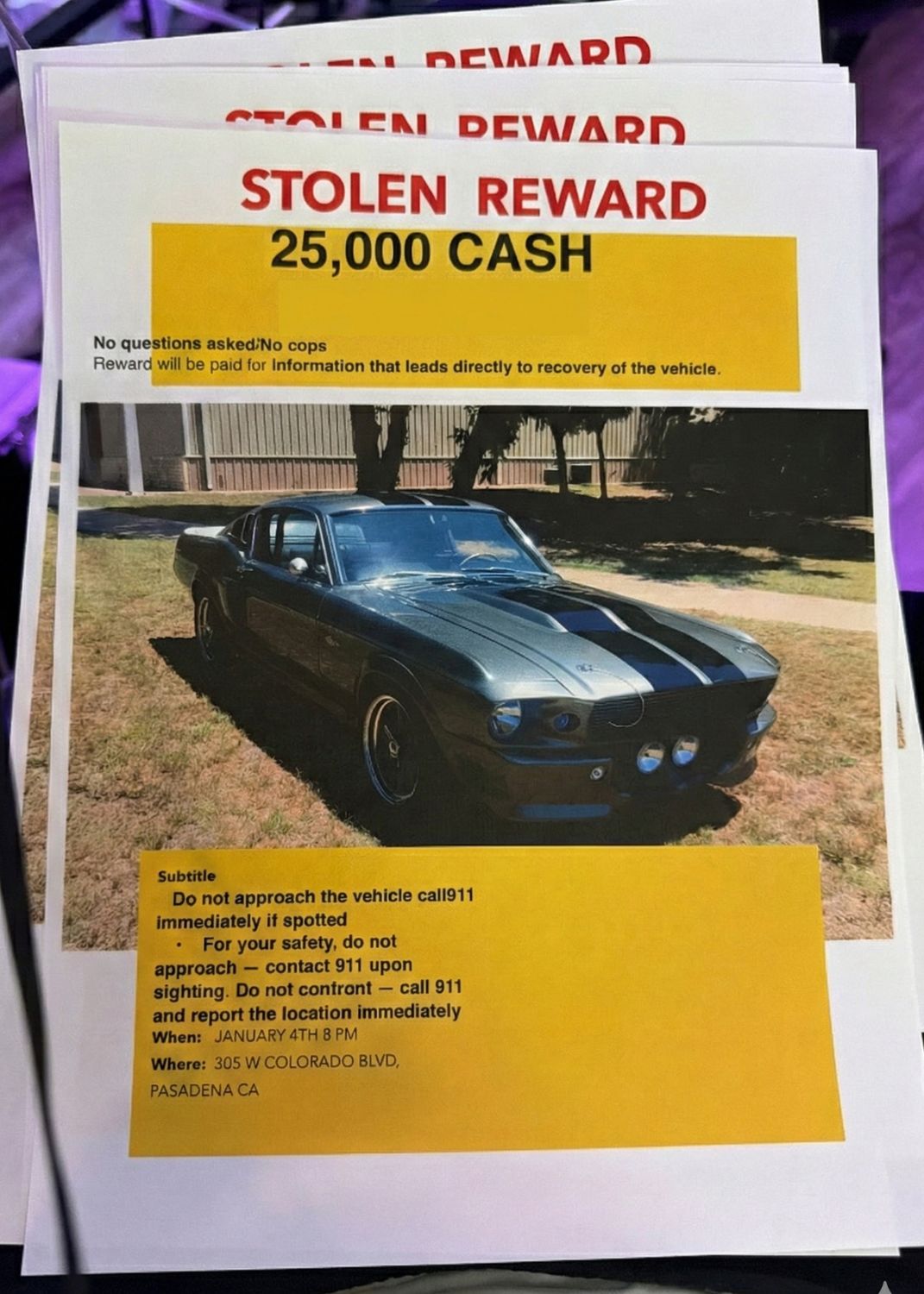 The registered owner of the vehicle is offering a $25,000 reward for information that directly leads to the recovery of the Mustang. Any reward is offered and paid solely at the discretion of the registered owner.